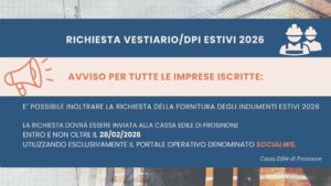 E’ possibile inoltrare la richiesta della fornitura degli indumenti da lavoro e D.P.I. per il periodo estivo 2026. La richiesta dovrà essere inviata alla Cassa Edile di Frosinone ENTRO E …
