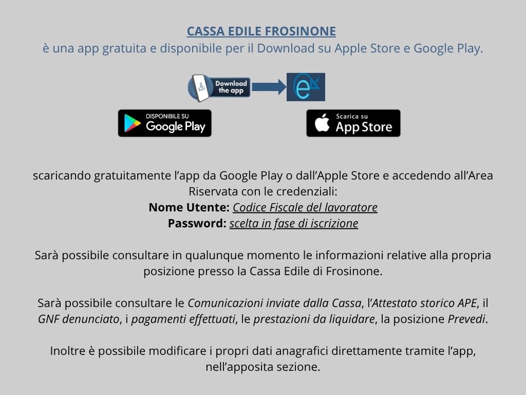 Scarica subito dallo store, “CASSA EDILE FROSINONE”, la nuova App dedicata a tutti i lavoratori del settore edile iscritti presso la Cassa Edile di Frosinone, e segui tutti i passaggi indicati di seguito: